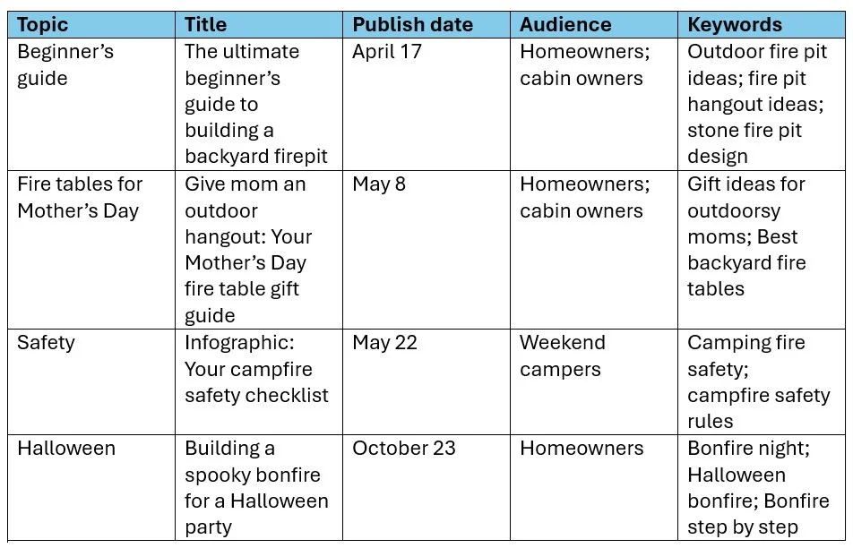 One of the best things about blogging is the flexibility. After you publish a few posts and gain subscribers you can use analytics tools to monitor performance, gather insights on audience behavior, and refine your approach. (This is a big topic, so we’ll cover that in a separate post). If the campfire safety infographic generated a lot of engagement, like clicks and shares, you could add additional infographic ideas to your calendar. And, from a tactical perspective, when you building your content calendar in a spreadsheet, it’s easy to add or delete columns once you determine the type of information you want to see in your calendar.